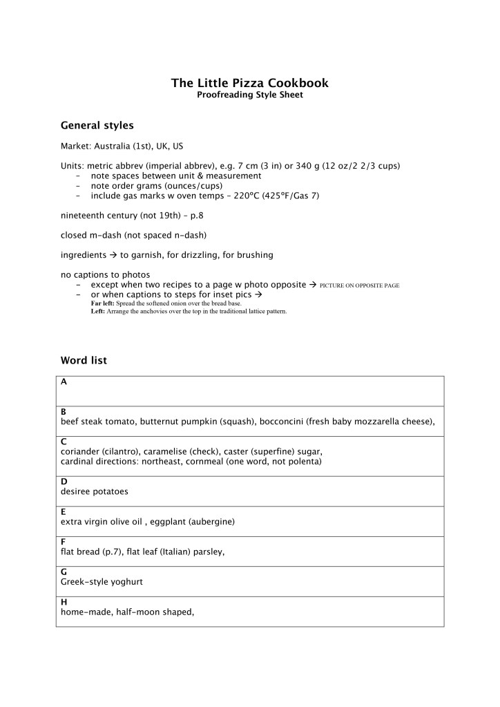 Cookbooks, however, are pretty technical beasts. Editing and proofreading cookbooks needs a terrier-like nose for inconsistencies. The big items to look out for are how to treat ingredient names, measurements and conversions, and how the methods are phrased.