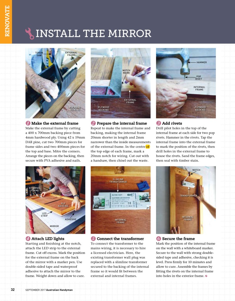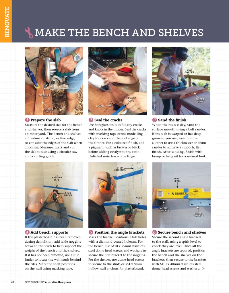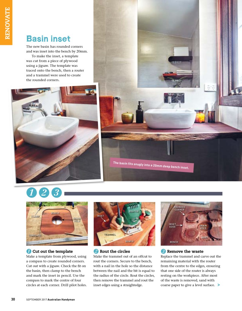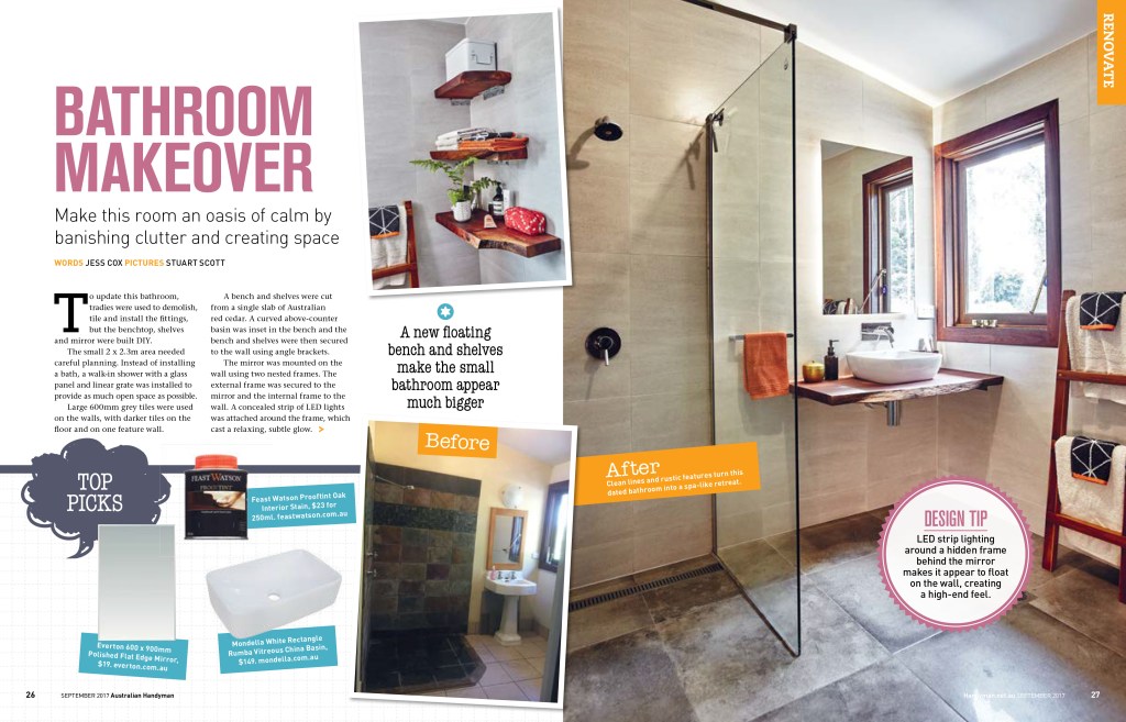 This article appeared in Australian Handyman magazine in September 2017, which featured the renovation of the main bathroom in our home. Together with writing the story and taking the step photographs, we made a bench (with an inset basin) and three open shelves from slabs of red cedar. The bathroom mirror was bordered by concealed LED strip lighting in a removable frame, which we custom-built.